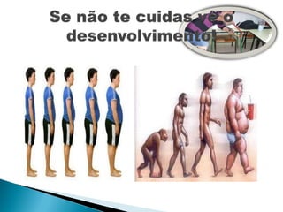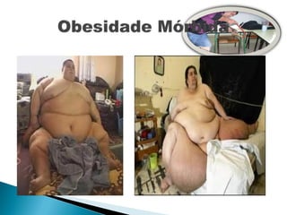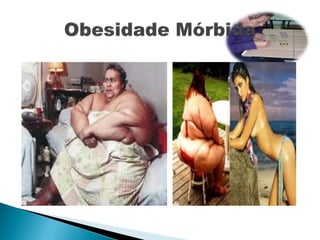 O documento discute obesidade, definindo-a como um aumento anormal ou excessivo de gordura corporal que traz riscos à saúde. A obesidade é resultado de um balanço energético positivo e está associada a doenças como diabetes, problemas cardíacos e alguns tipos de câncer. O tratamento envolve mudanças na dieta, exercícios e, em alguns casos, medicamentos ou cirurgia.