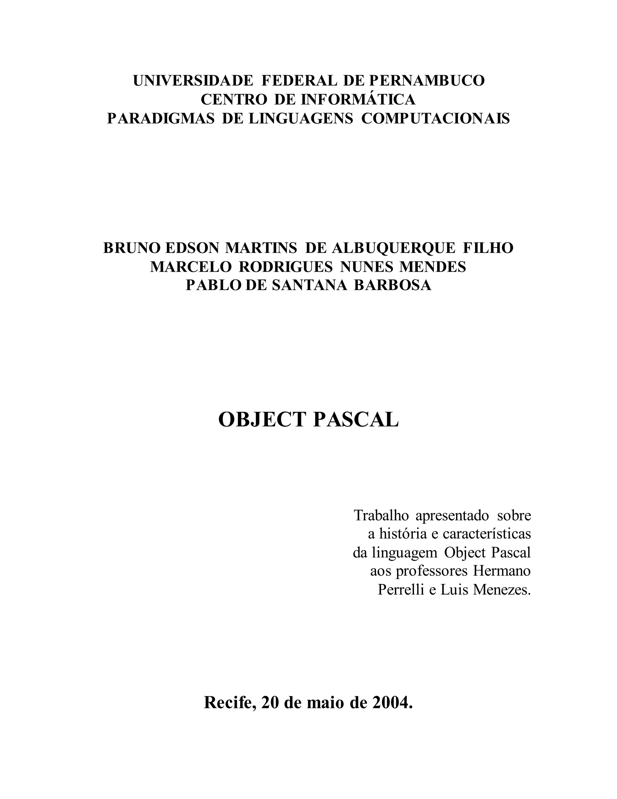 O documento descreve a história e características da linguagem Object Pascal, começando com suas origens no Pascal e como foi estendida para suporte a orientação a objetos. Ele também discute a relação entre a linguagem e o ambiente de desenvolvimento Delphi da Borland.