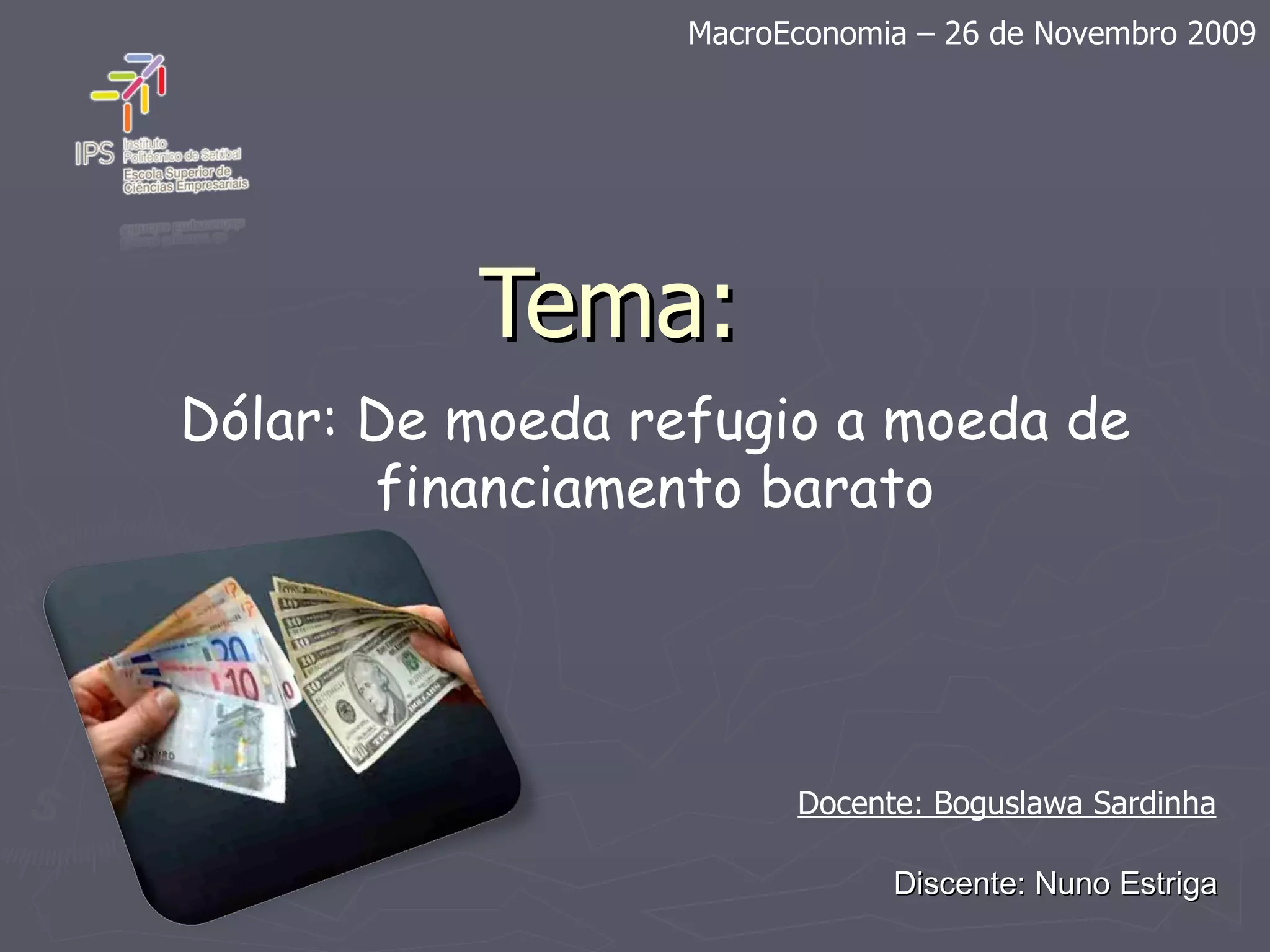 O documento discute o objetivo dos EUA de tornar o dólar uma moeda barata de financiamento internacional enquanto a economia se recupera gradualmente. Argumenta que, embora o dólar possa permanecer fraco no curto prazo, nenhuma outra moeda está pronta para substituí-lo como principal moeda de comércio e finanças globais no médio e longo prazo.