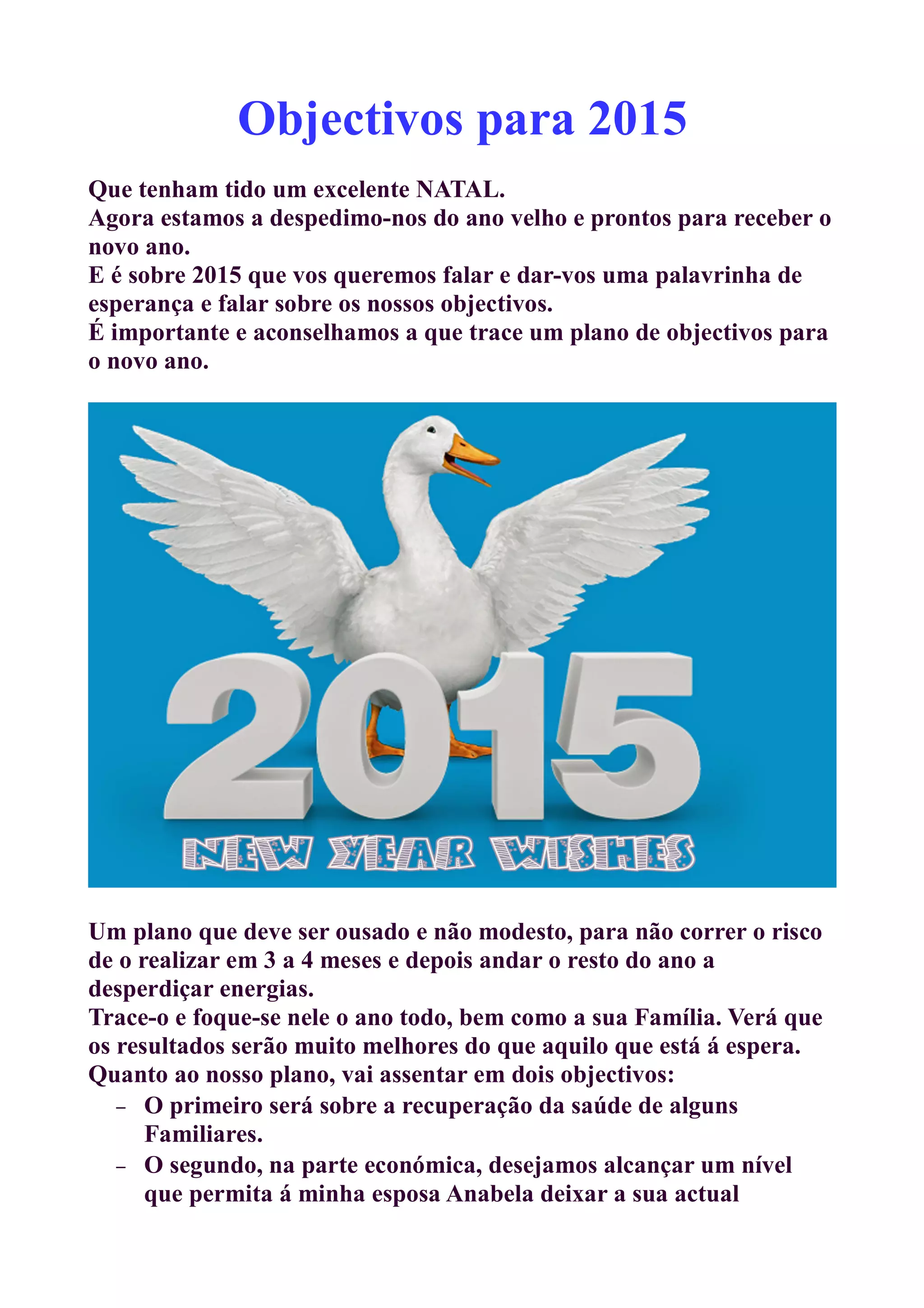Este documento apresenta os objetivos para 2015 de uma família. Seus objetivos incluem melhorar a saúde de familiares, alcançar um nível financeiro que permita que a esposa deixe seu trabalho e se dedique totalmente ao negócio, e adquirir uma nova casa com piscina. A família encoraja outras pessoas a traçarem seus próprios objetivos com suas famílias para o novo ano.