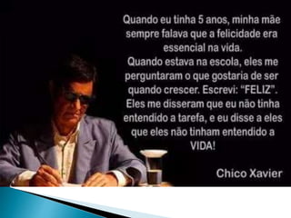 O documento discute questões existenciais como o propósito da vida, a origem do homem e sua maior característica, o livre arbítrio. Também aborda tópicos como felicidade, objetivos materiais versus espirituais, transformações da vida, leis espirituais e a importância de desenvolver o amor e a caridade.