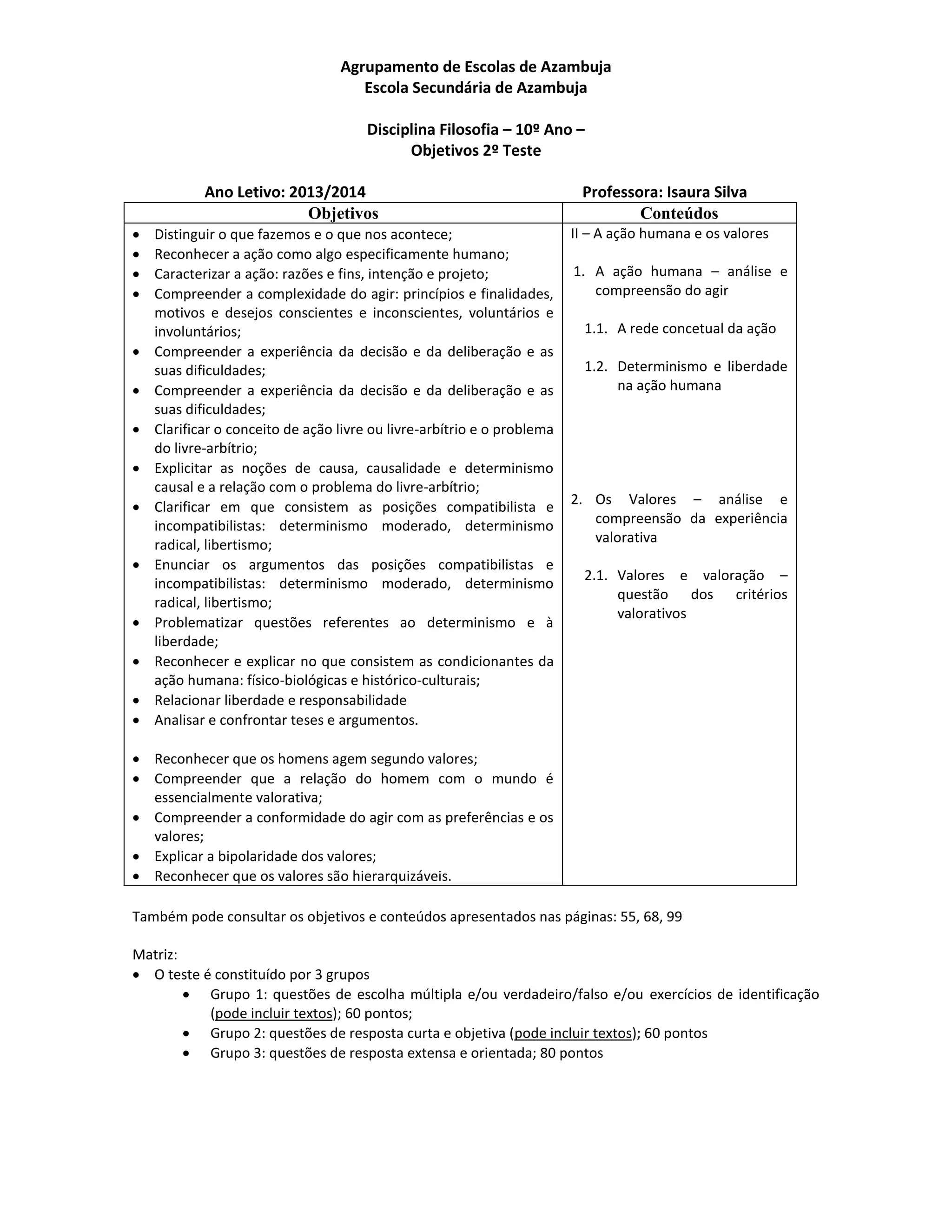 Este documento apresenta os objetivos e conteúdos do 2o teste de Filosofia do 10o ano. Os objetivos incluem compreender a ação humana, o livre-arbítrio, os valores e a experiência valorativa. Os conteúdos são a ação humana, o determinismo e liberdade, e os valores e valoração. O teste será constituído por três grupos de questões avaliadas em 60, 60 e 80 pontos respetivamente.