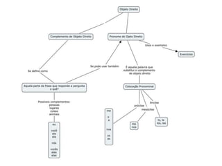 O documento explica o que são objetos diretos e pronomes objetos diretos em três partes: (1) define objetos diretos como complementos que respondem à pergunta "o quê?"; (2) define pronomes objetos diretos como palavras que substituem objetos diretos; (3) discute onde os pronomes objetos diretos aparecem na frase dependendo da estrutura da frase.