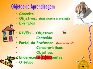 O documento discute objetos de aprendizagem, definindo-os como qualquer recurso que pode ser reutilizado para apoiar a aprendizagem, como imagens, páginas HTML, animações ou simulações. Também fornece exemplos de objetos de aprendizagem, como o programa "Teia do Saber" e a Rede Interativa Virtual de Educação.