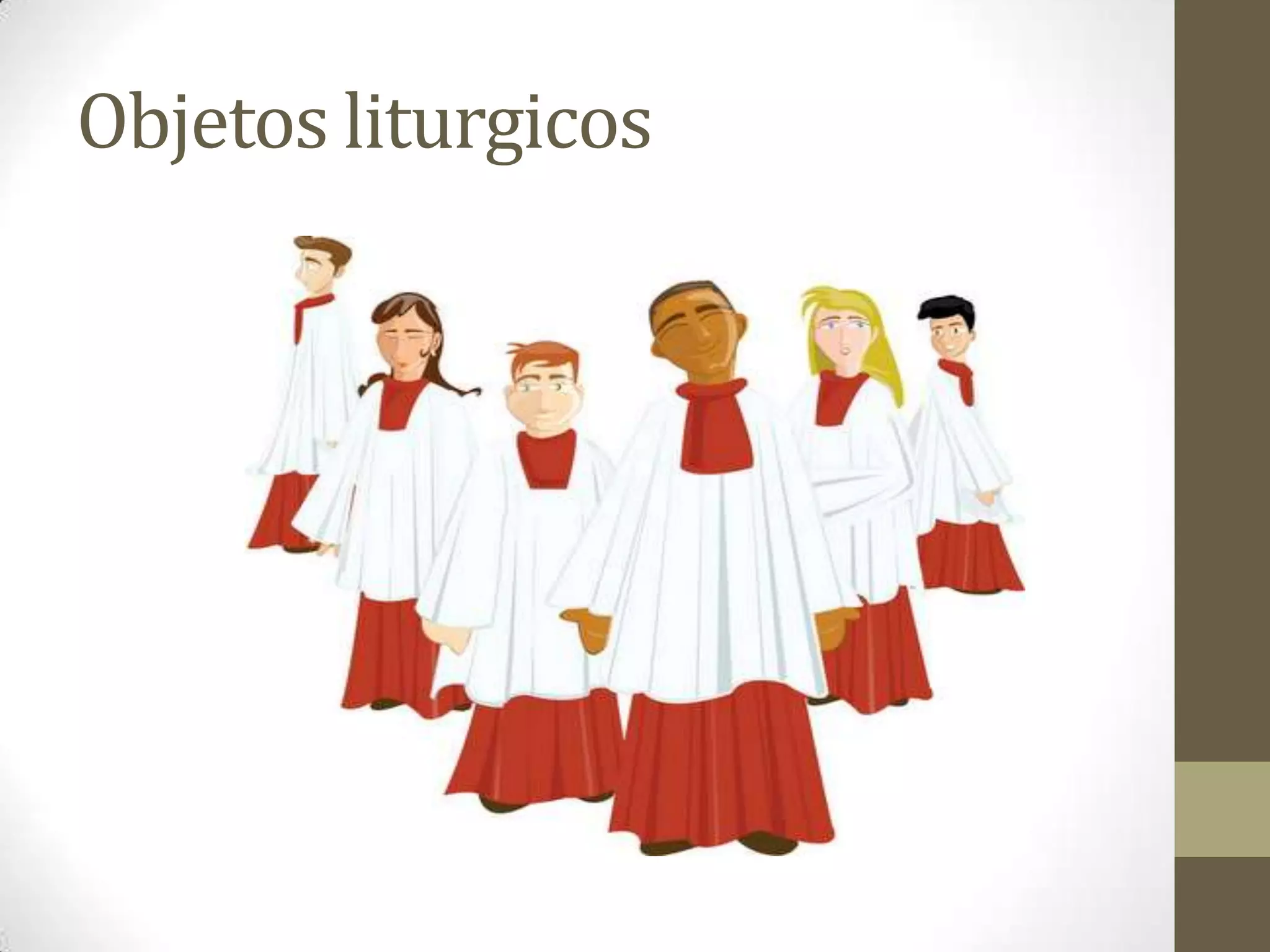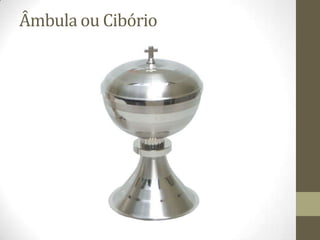O documento lista e descreve objetos litúrgicos utilizados na missa católica, incluindo o cibório, cálice, custódia, patena, teca, aspersório, caldeira de água benta, castiçal, corporal, credência, galhetas, hóstia, lavabo, manustérgio, naveta, pala, sanguinho, turíbulo e vela.