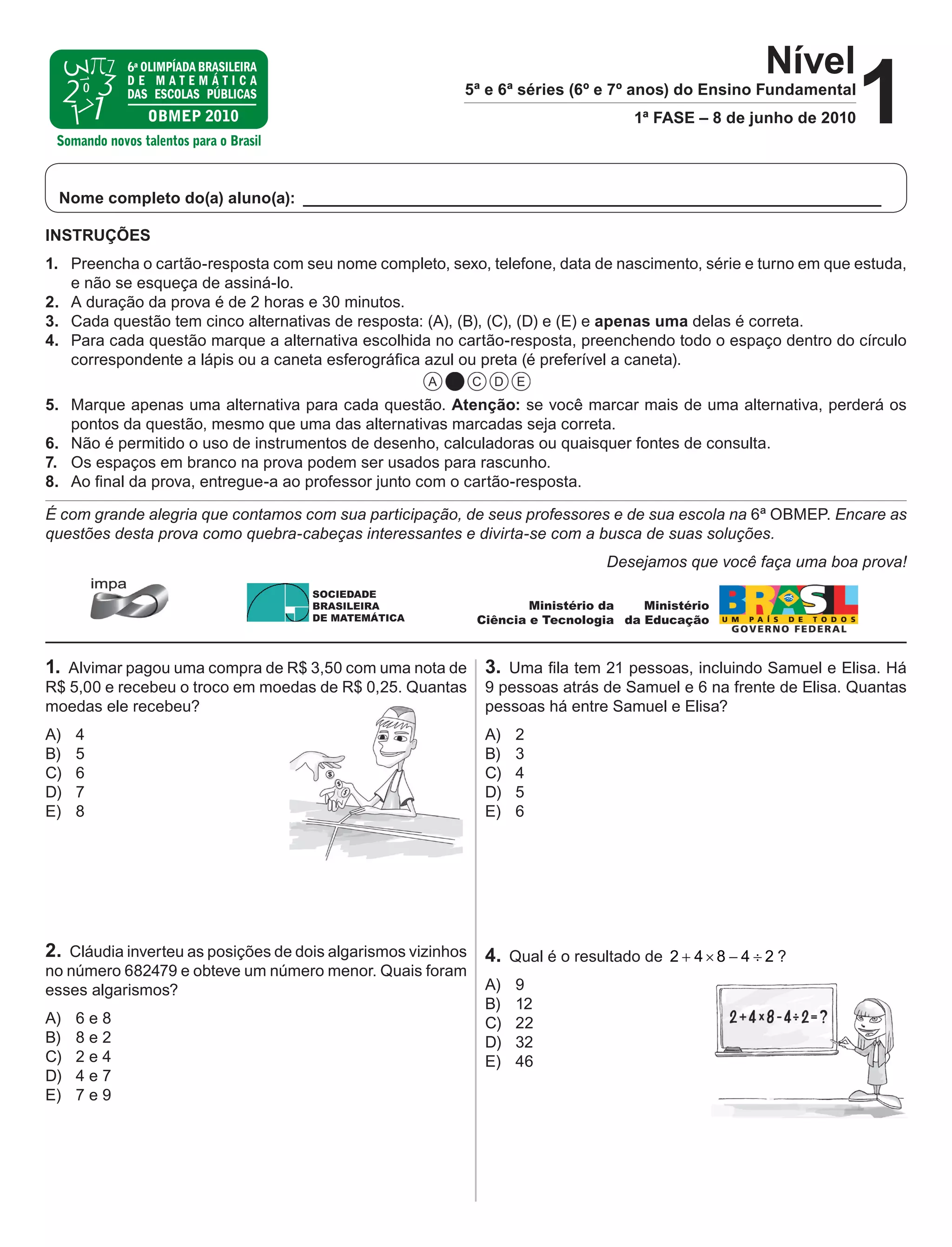 1. O documento apresenta uma prova da OBMEP (Olimpíada Brasileira de Matemática das Escolas Públicas) para alunos de 5a e 6a séries do Ensino Fundamental, contendo 20 questões.