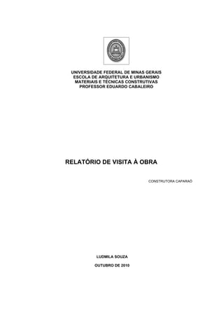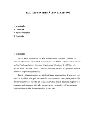 O relatório descreve uma visita técnica de alunos a uma obra da construtora Caparaó. A obra consiste em um prédio comercial de 28 andares com estrutura convencional de pilares, vigas e lajes nervuradas de concreto. O relatório detalha os processos construtivos observados, incluindo o uso de fôrmas, escoramentos e tubulação para concretagem.