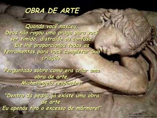 O documento fala sobre como cada pessoa é uma obra de arte em potencial que pode ser completada. Cita Michelangelo dizendo que dentro da pedra já existe uma obra de arte e ele apenas remove o excesso, e diz que dentro de cada pessoa já existe uma linda obra de arte que pode ser completada ao remover o excesso. Conclui que somos os artistas de nossa própria criação e podemos escolher diariamente ser quem queremos ser.