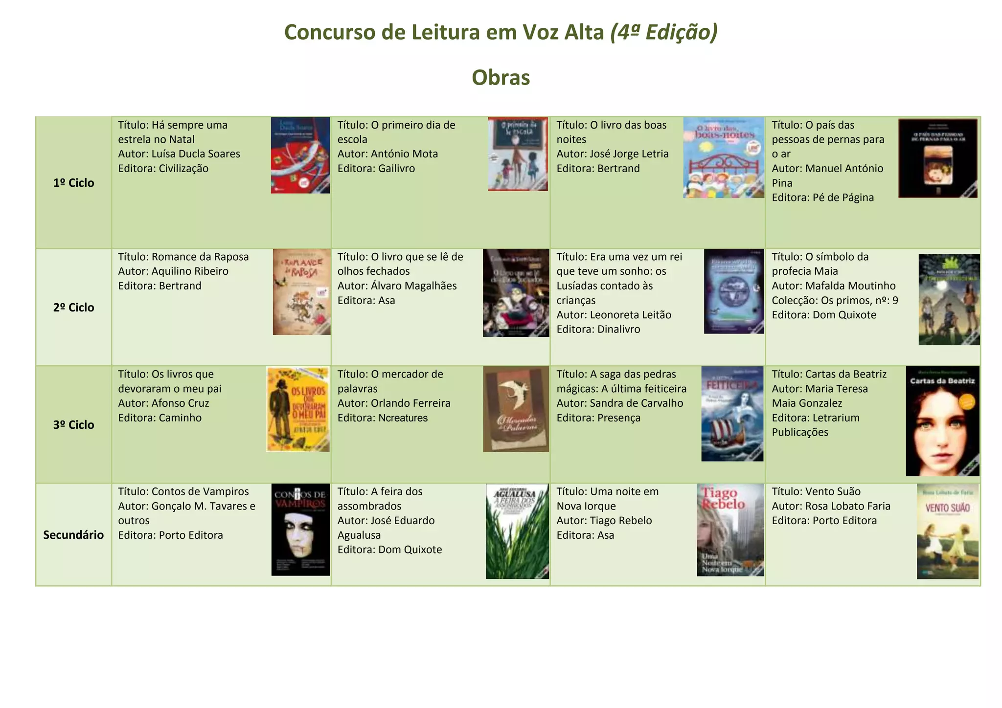 O documento lista os títulos de livros e seus autores que serão lidos em voz alta em um concurso para diferentes níveis de ensino, incluindo o 1o, 2o e 3o ciclos do ensino básico e o secundário.