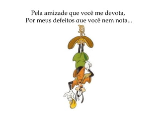 Este poema agradece a um amigo por sua amizade constante, apoio incondicional, lealdade e por compartilhar momentos felizes e tristes juntos. O poema destaca a importância deste amigo por aceitar os defeitos um do outro, manter os segredos um do outro em sigilo, e por apontar um ao outro a fé em Deus.