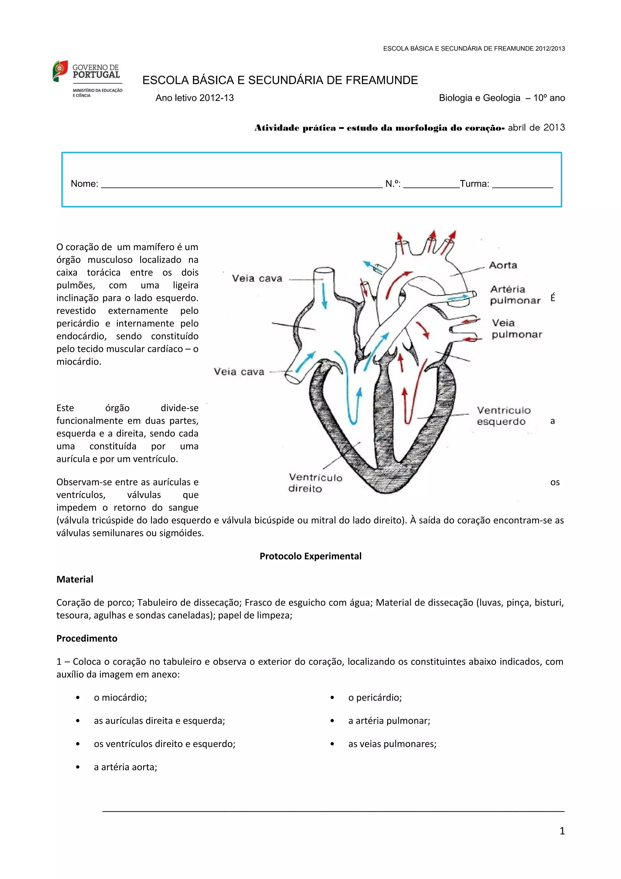 O documento descreve um protocolo experimental para estudar a morfologia do coração de porco. Os alunos devem observar e dissecar o coração, identificando estruturas como as aurículas, ventrículos, válvulas e vasos sanguíneos. Eles também devem responder perguntas sobre as diferenças entre os lados direito e esquerdo do coração e sobre as funções de estruturas como as válvulas.