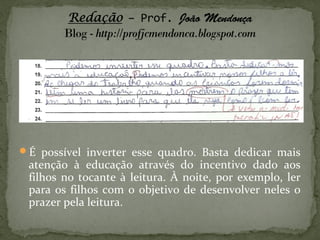 O documento discute a importância da leitura na formação do cidadão e da sociedade, a baixa taxa de leitura no Brasil, e como os pais podem incentivar o hábito da leitura nos filhos desde cedo.
