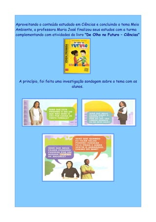Os alunos da 3a série fizeram um projeto sobre o meio ambiente onde investigaram o tema, discutiram soluções para problemas ambientais e criaram cartazes com dicas para cuidar do meio ambiente. Eles também estudaram a poluição da água em aulas de ciências.