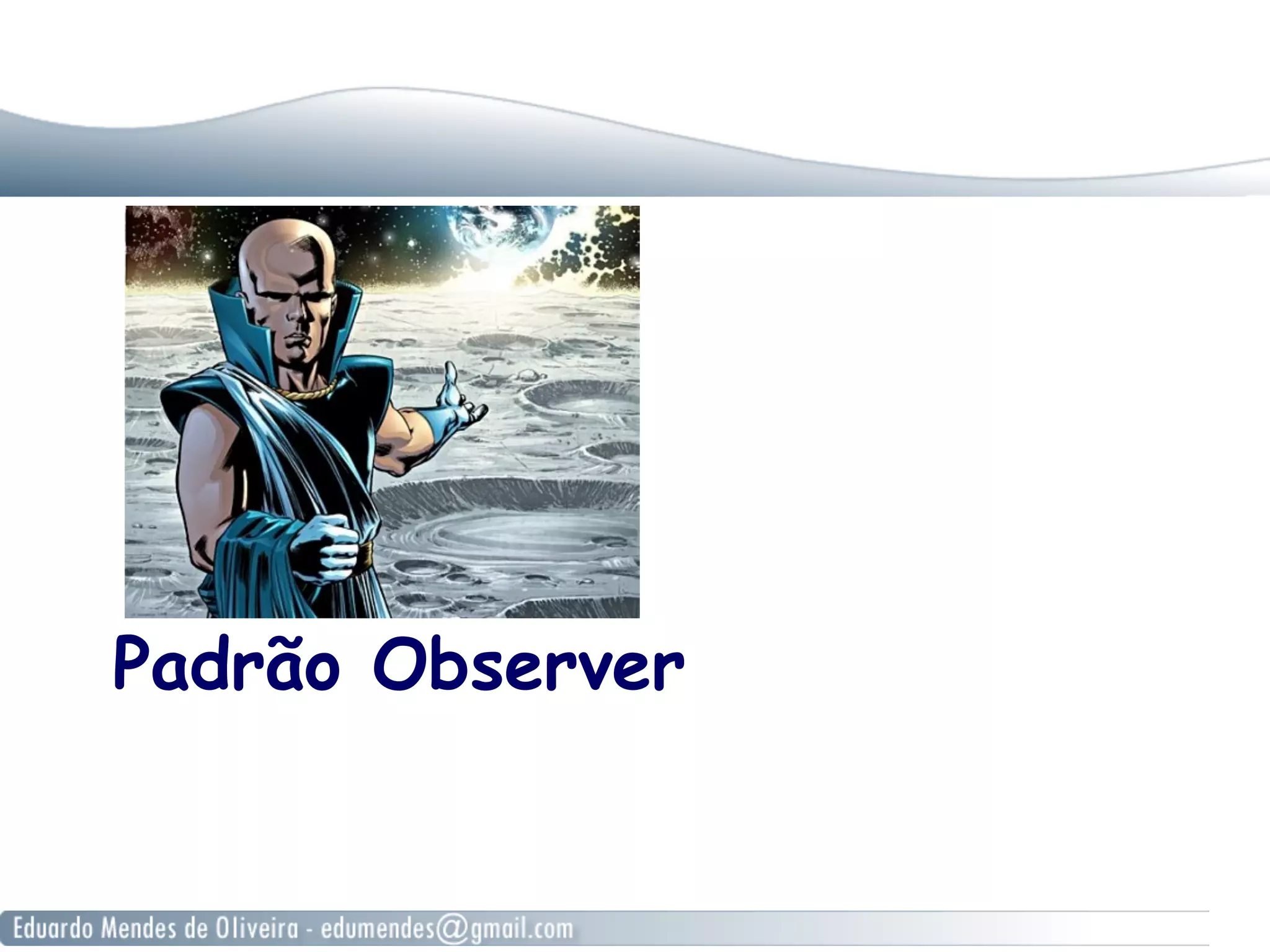 Este documento descreve a implementação do Padrão Observer para criar uma aplicação de monitoramento do tempo. O Padrão Observer define que objetos observadores sejam notificados automaticamente quando o estado de um objeto assunto for alterado. A aplicação terá uma classe DadosDoTempo que armazena as medições meteorológicas e notificará telas observadoras quando os dados forem atualizados.