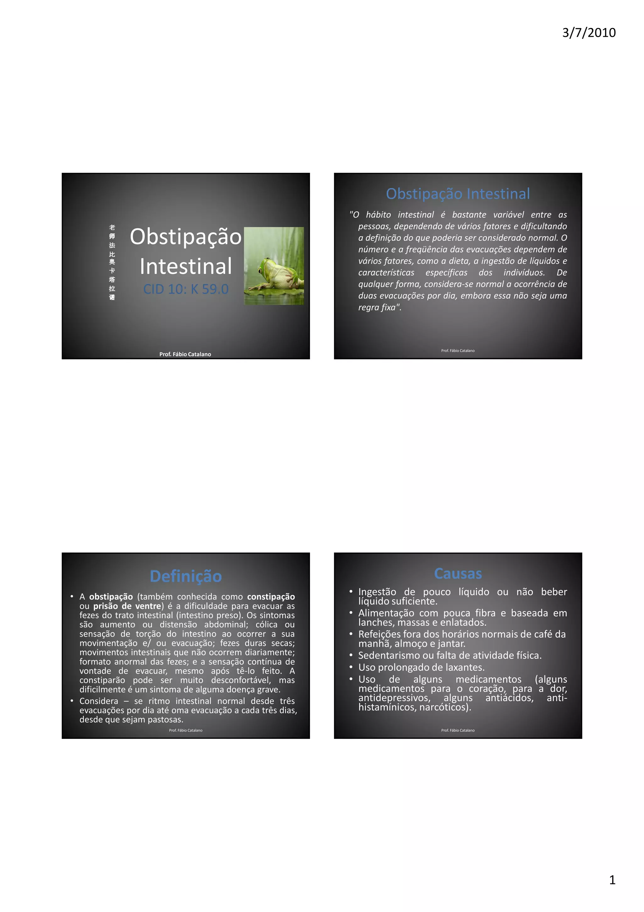 O documento discute obstipação intestinal. Ele fornece definições de obstipação, causas, sintomas, exames, prevenção e tratamento. O documento também discute diferentes tipos de obstipação de acordo com a medicina tradicional chinesa, incluindo calor, qi e deficiência.