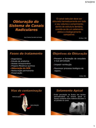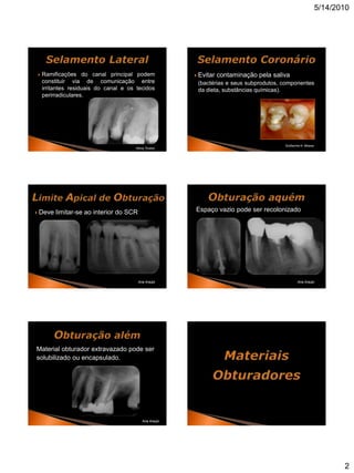 O documento discute a obturação do sistema de canais radiculares. Ele enfatiza a importância de se obturar todo o comprimento e volume do canal de forma hermética usando um material biologicamente compatível para promover a cicatrização e impedir reinfecções. Ele também descreve os requisitos e tipos de materiais obturadores.