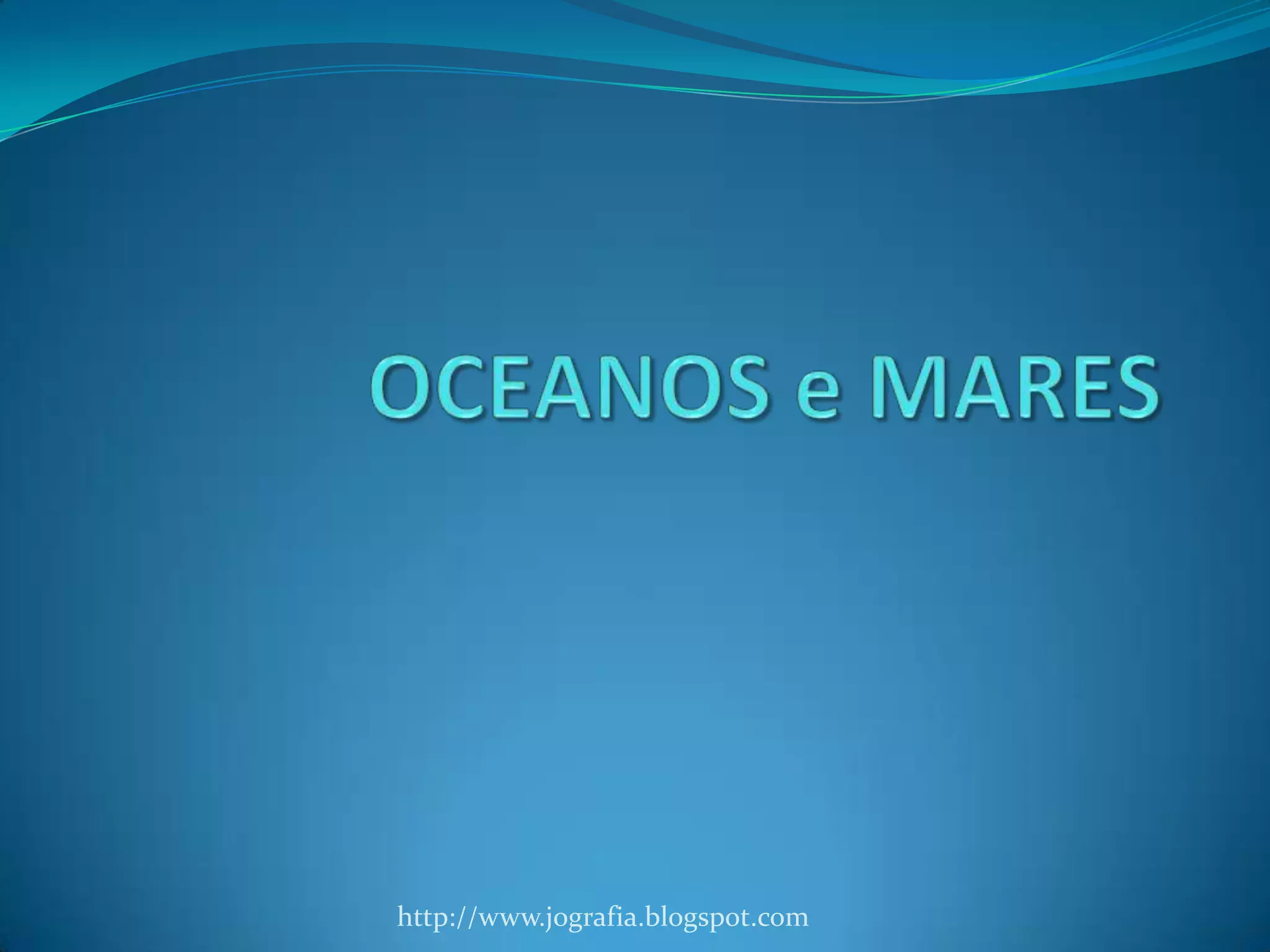 O documento descreve os oceanos e mares da Terra. Os oceanos ocupam a maior parte da superfície terrestre e podem ser divididos em cinco grandes massas de água. O relevo oceânico inclui a plataforma continental, o talude continental, a região pelágica e a região abissal. Os mares podem ser abertos, interiores ou fechados.