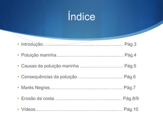 O documento aborda a poluição marinha, destacando suas causas, consequências e o impacto das marés negras. A poluição está associada ao aumento da população e atividades industriais, resultando na contaminação de ecossistemas e alimentos. A erosão da costa e acidentes de transporte de petróleo também são mencionados como problemas graves que afetam os oceanos.