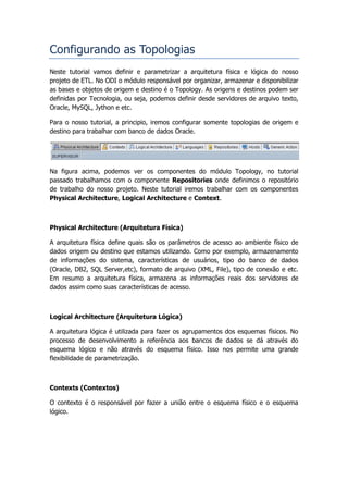 1) O documento descreve como configurar as topologias no Oracle Data Integrator (ODI) para definir as origens e destinos de dados para um projeto de ETL. 2) Inclui detalhes sobre como configurar as arquiteturas física, lógica e contextos no ODI para mapear as bases de dados físicas às lógicas. 3) Fornece exemplos de como criar servidores de dados, esquemas físicos, contextos e esquemas lógicos no ODI.