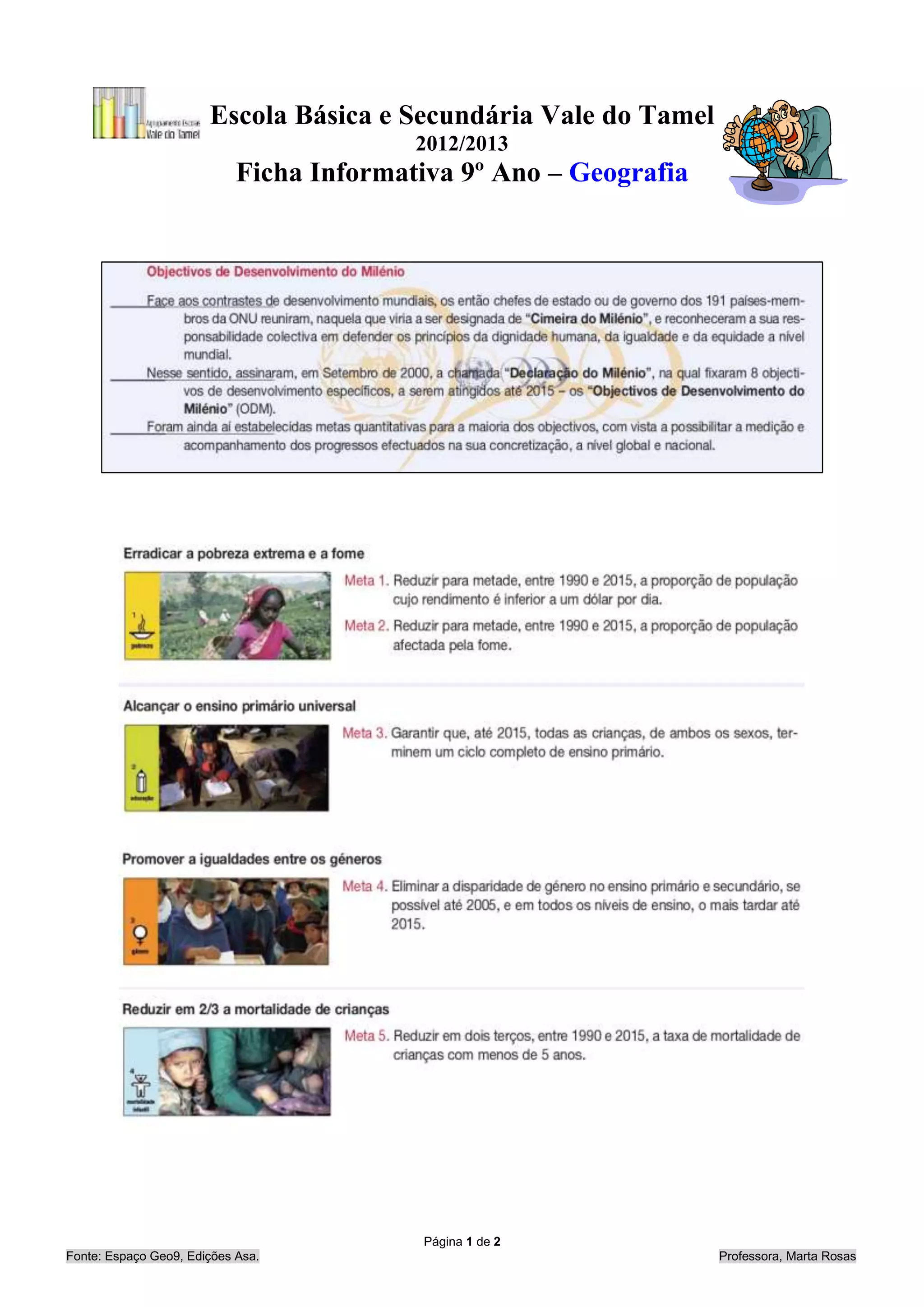 Este documento fornece informações sobre o 9o ano de Geografia na Escola Básica e Secundária Vale do Tamel para o ano letivo de 2012/2013. A professora Marta Rosas usará o livro didático Espaço Geo9 da editora Asa para ensinar a matéria.