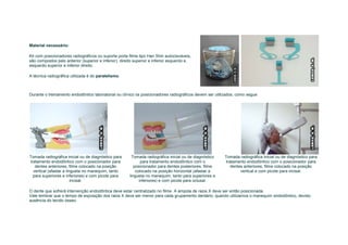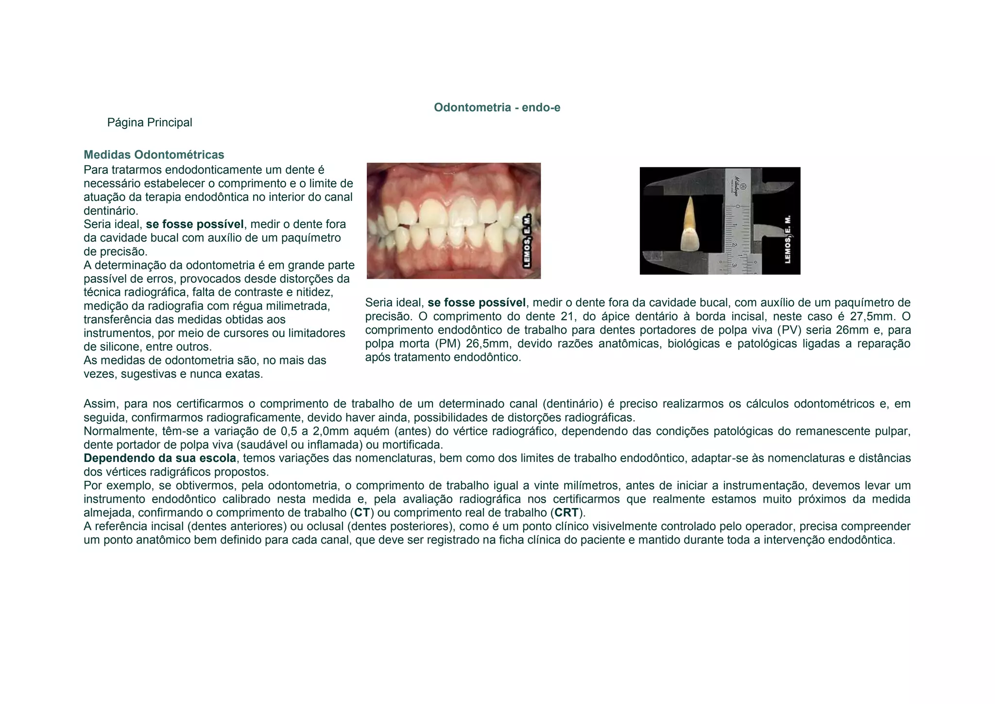 O documento fornece instruções sobre medidas odontométricas e técnicas radiográficas para tratamento endodôntico. Ele descreve como medir o comprimento aparente do dente usando radiografias iniciais e determinar o comprimento real de trabalho do canal usando instrumentos calibrados e radiografias de confirmação. Também discute equipamentos e técnicas necessários para garantir a precisão das medidas e imagens radiográficas.