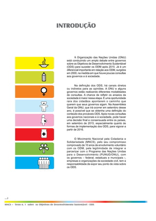 O documento discute a transição dos Objetivos de Desenvolvimento do Milênio (ODM) para os Objetivos de Desenvolvimento Sustentável (ODS) definidos pelas Nações Unidas. Ele resume os avanços trazidos pelos ODM no Brasil e no mundo, mas também reconhece limitações como a desigualdade. O documento defende que os ODS devem promover desenvolvimento sustentável, reduzir desigualdades e incluir novas metas sobre mudanças climáticas e sustentabilidade.