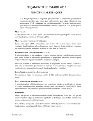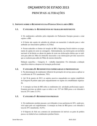 Este documento resume as principais alterações ao Orçamento de Estado para 2013, incluindo: 1) Alterações aos impostos sobre o rendimento das pessoas singulares e coletivas e à segurança social, como a redução de escalões de IRS e limites de deduções; 2) Ampliação da taxa do IVA sobre certas atividades agrícolas e alargamento de isenções; 3) Limitação à dedução de gastos financeiros em IRC.