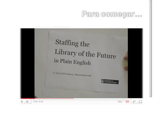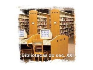 O documento discute o papel das bibliotecas escolares e dos professores bibliotecários no contexto das novas tecnologias digitais. Aprendizagem baseada em projetos e o desenvolvimento de literacias digitais são essenciais para o sucesso dos alunos. Os professores bibliotecários devem colaborar com outros professores para integrar recursos físicos e digitais nos programas escolares.