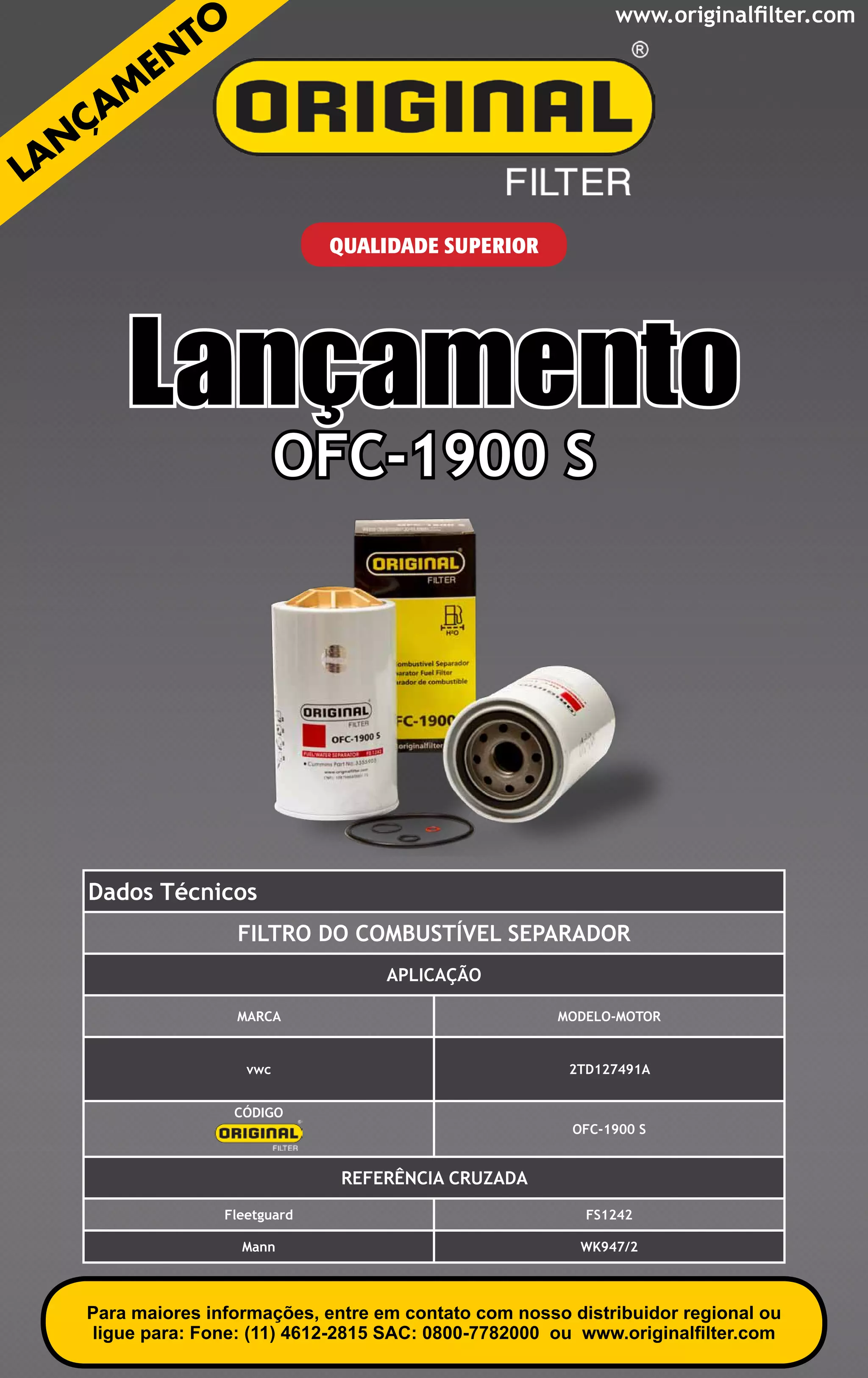 O documento apresenta o novo filtro de combustível separador OFC-1900 S da Original Filter para motores VW 2TD127491A, fornecendo seus dados técnicos, código e referências cruzadas para outros modelos similares de outras marcas como Fleetguard e Mann. Informações adicionais podem ser obtidas entrando em contato com o distribuidor regional ou ligando para o número indicado.