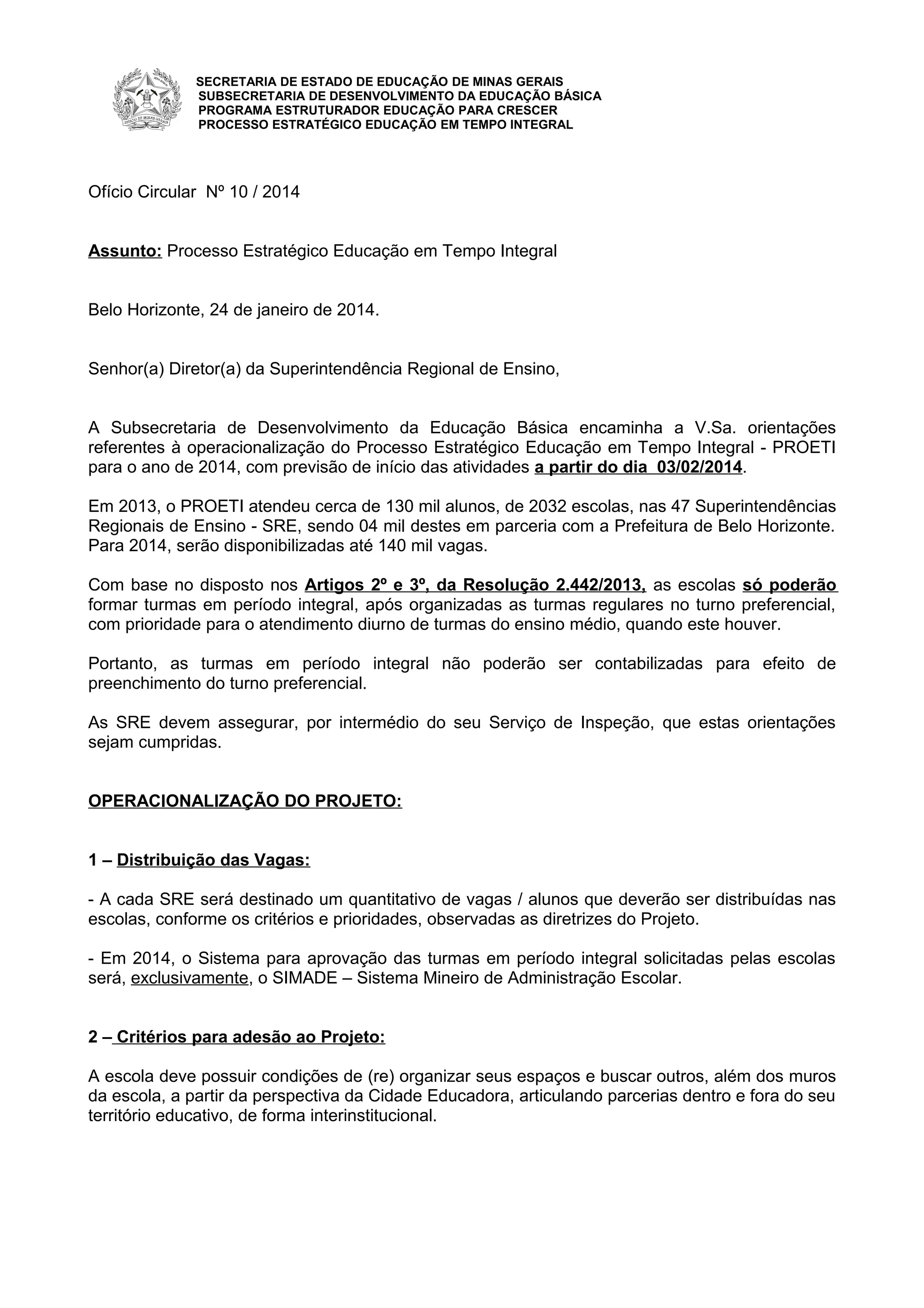 Este documento fornece orientações sobre a implementação do Processo Estratégico Educação em Tempo Integral (PROETI) em Minas Gerais para 2014, incluindo a distribuição de até 140 mil vagas, critérios de prioridade para alunos em situação de vulnerabilidade, organização de turmas e atividades, e cronograma para enturmação entre 3 de fevereiro e 28 de fevereiro.