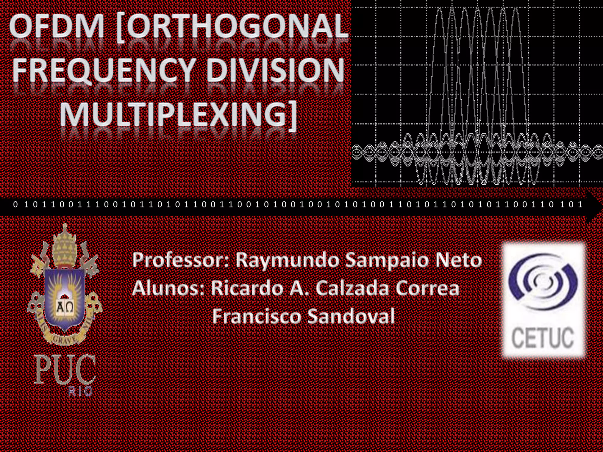 O documento descreve as principais características de sistemas de transmissão de dados por OFDM (Orthogonal Frequency Division Multiplexing). O OFDM divide o canal de transmissão em várias subportadoras ortogonais para transmitir dados em paralelo, aumentando a taxa de dados e a robustez ao ruído e interferências. Sistemas como Blu-ray, HD DVD e DVD usam diferentes taxas de dados e formatos de vídeo com OFDM.