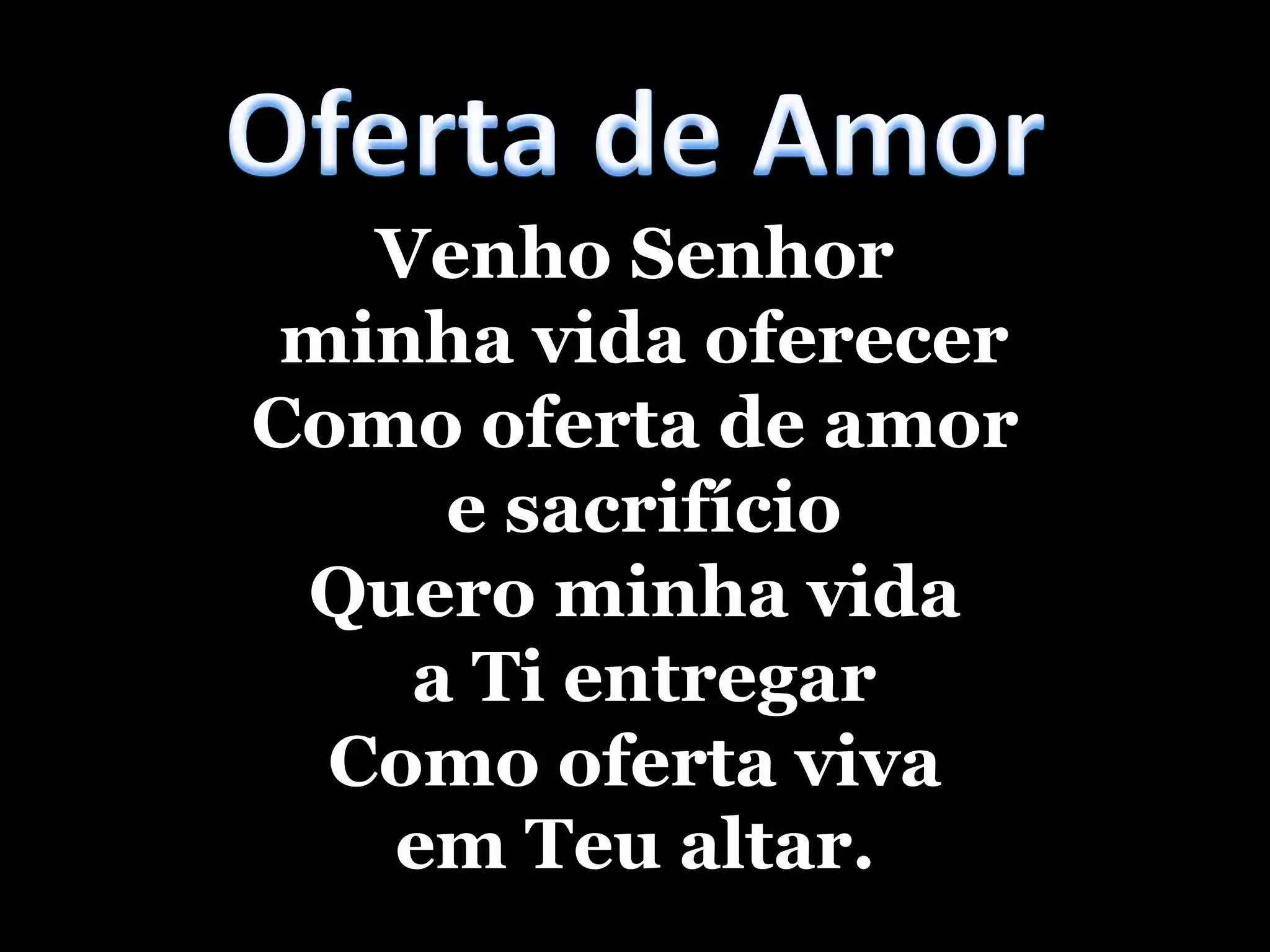 Oferta de AmorVenhoSenhor minha vida oferecerComo oferta de amor e sacrifícioQuero minha vida a Ti entregarComo oferta viva em Teu altar.