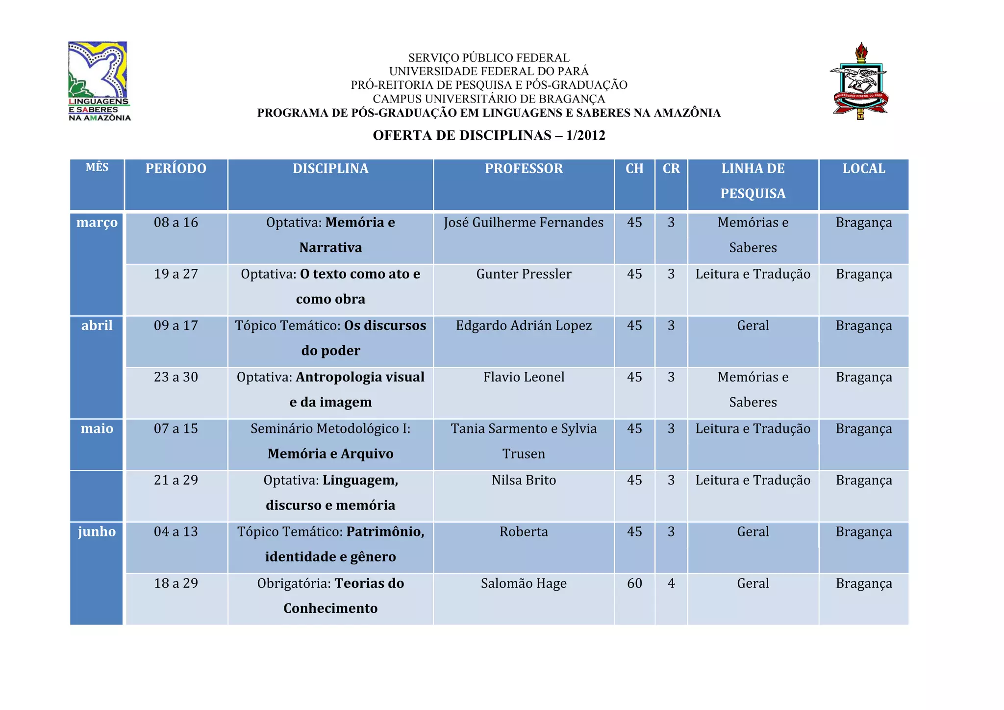Este documento apresenta a oferta de disciplinas do Programa de Pós-Graduação em Linguagens e Saberes na Amazônia para o primeiro semestre de 2012, com as disciplinas, professores, carga horária, créditos e linha de pesquisa correspondentes a cada disciplina ofertada nos meses de março a junho. A proposta considerou a necessidade de ofertar as disciplinas em blocos de tempo para facilitar o pagamento de diárias e andamento das atividades, alternando entre as linhas de pesquisa e com antecedência na disponibilização de materiais para os alun