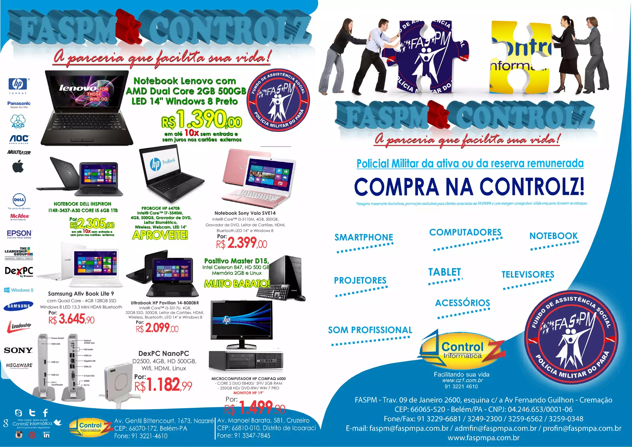 O documento lista vários produtos eletrônicos à venda, incluindo notebooks da Sony, HP e Samsung, além de desktops, monitores, projetores e smartphones. Os notebooks variam em processadores, memória, armazenamento e sistema operacional, principalmente Windows 8.