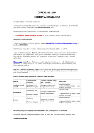 O documento informa sobre a mudança para a plataforma Microsoft Office 365, fornecendo instruções sobre como acessar a nova conta de email na webmail.kroton.com.br usando o login e senha recebidos por email. Também explica que os endereços de email podem sofrer pequenas alterações e fornece um esquema com os novos endereços de acordo com a função.