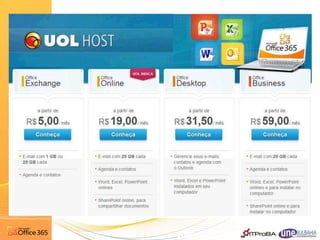 O documento apresenta o Office 365, um serviço de computação em nuvem da Microsoft que fornece ferramentas de colaboração corporativa como email, armazenamento em nuvem, editores online e comunicação instantânea. O Office 365 permite acesso a aplicativos da suíte Office de qualquer local e dispositivo de forma escalonável e com alta disponibilidade.