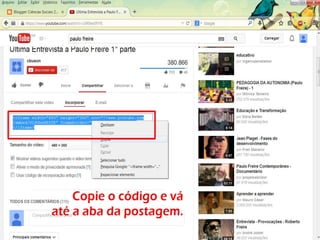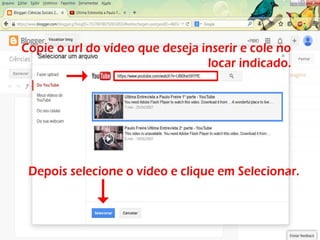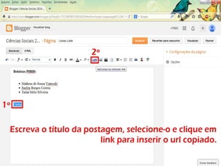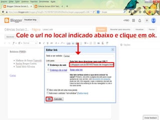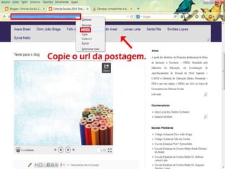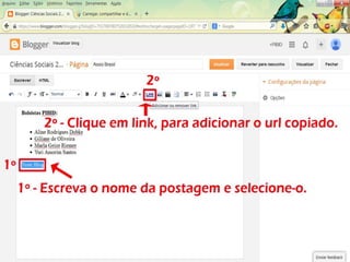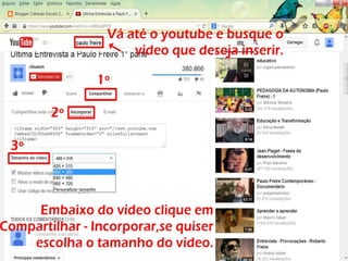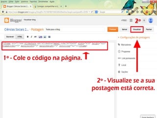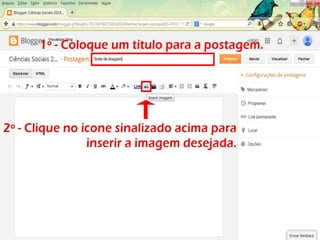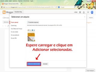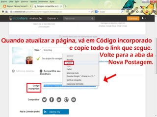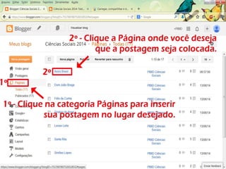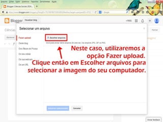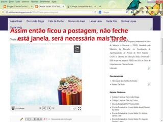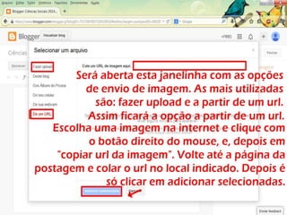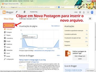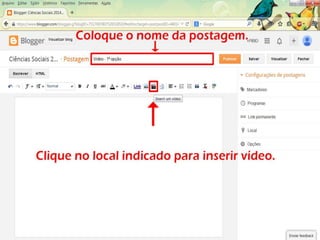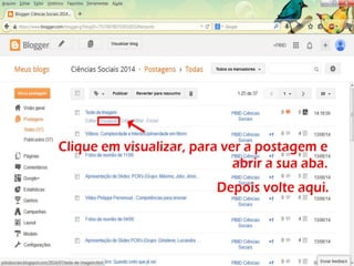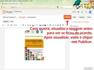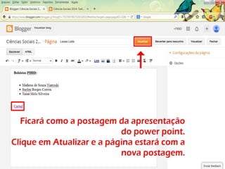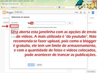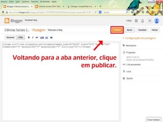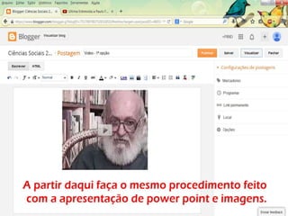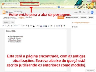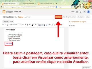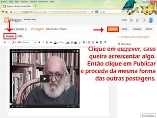 Este documento fornece instruções sobre como fazer postagens no blog, incluindo usar a fonte padrão, justificar o texto, centralizar imagens e vídeos, e não alterar configurações como layout e modelo.