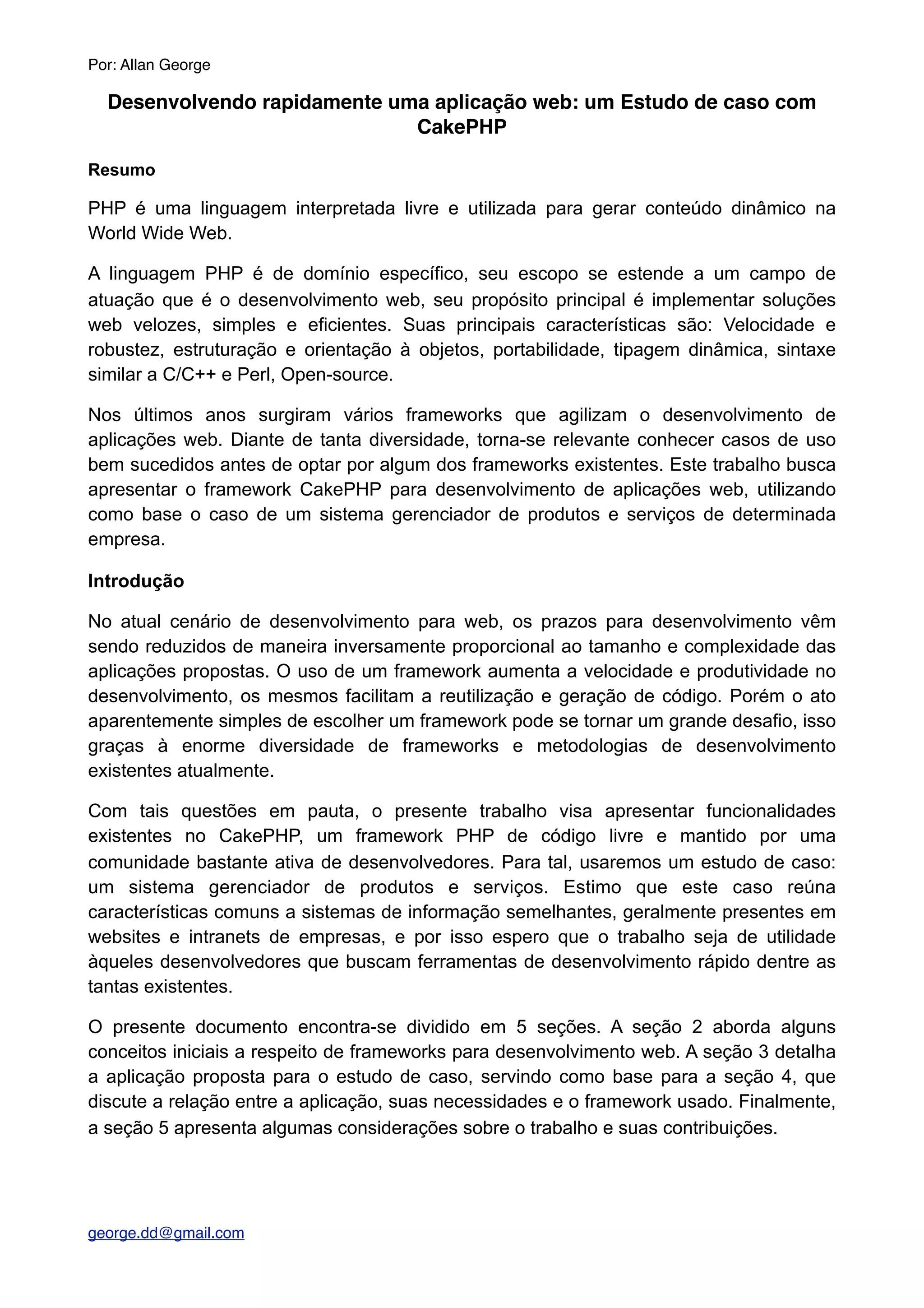 Este documento apresenta o framework CakePHP para desenvolvimento rápido de aplicações web, usando como estudo de caso um sistema gerenciador de produtos e serviços. Descreve as principais características do CakePHP como MVC, ORM e geração automática de CRUD e como estas funcionalidades foram aplicadas no caso de uso.