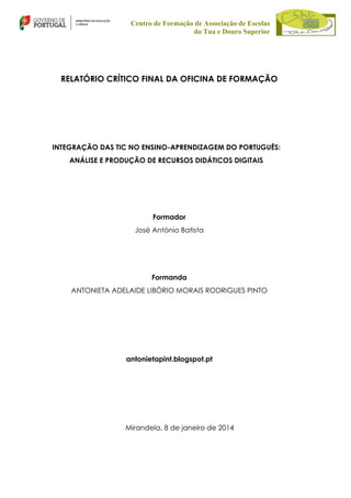 Um relatório final de uma oficina de formação para professores sobre como integrar tecnologias da informação e comunicação no ensino e aprendizagem de português. O relatório descreve a análise e produção de recursos digitais educacionais e foi escrito por uma professora participante sob a orientação do formador José António Batista em janeiro de 2014.