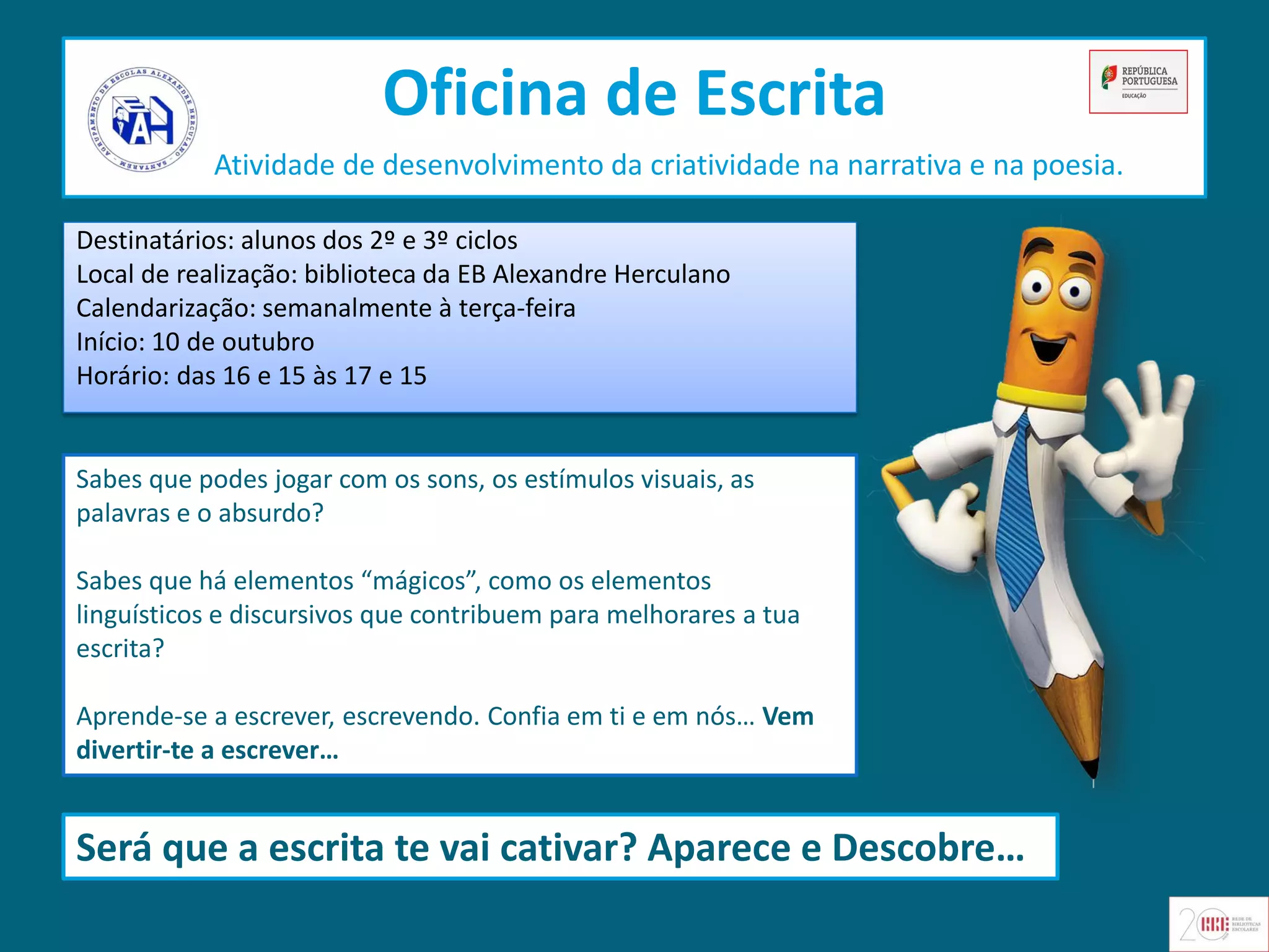 A oficina de escrita irá acontecer semanalmente às terças-feiras na biblioteca da EB Alexandre Herculano, começando em 10 de outubro, das 16:15 às 17:15, e será destinada aos alunos dos 2o e 3o ciclos. A oficina tem como objetivo desenvolver a criatividade dos alunos na narrativa e poesia por meio de estímulos visuais, sonoros e elementos linguísticos.