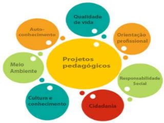 Este documento fornece orientações sobre projetos pedagógicos, incluindo o que é um projeto, como planejá-lo, características de uma boa proposta e como apresentá-la à turma. Oferece exemplos de projetos em diferentes disciplinas como língua portuguesa, matemática e ciências.