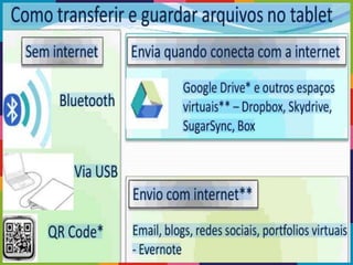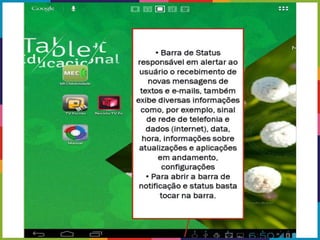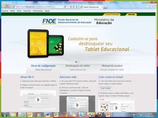 O documento fornece instruções sobre o uso de tablets educacionais. Ele explica como configurar e usar os recursos básicos do tablet, como conectar-se à internet sem fio, transferir arquivos via Bluetooth e ajustar configurações como som, brilho e armazenamento. O documento também discute os aplicativos educacionais disponíveis e como desbloquear e registrar o tablet.