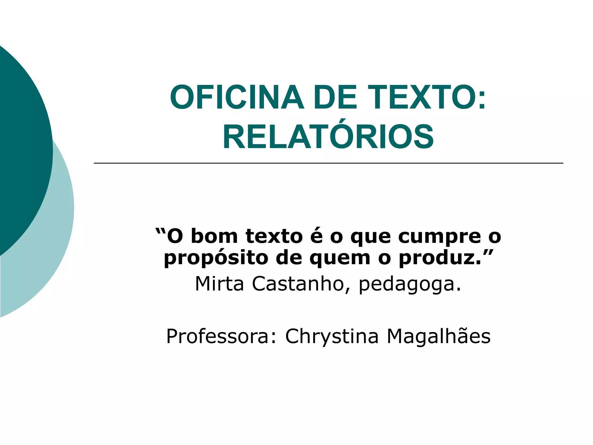 OFICINA DE TEXTO:RELATÓRIOS “ O bom texto é o que cumpre o propósito de quem o produz.” Mirta Castanho, pedagoga. Professora: Chrystina Magalhães