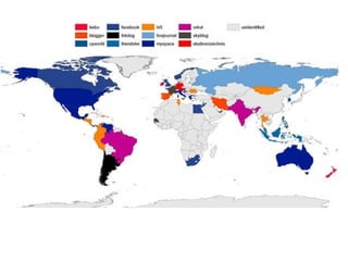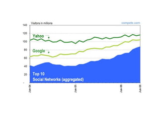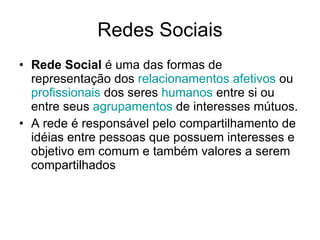 O documento discute o conceito de redes sociais e como elas funcionam. 1) Redes sociais representam as relações entre pessoas e grupos e compartilhamento de ideias. 2) Essas redes estão principalmente na internet, permitindo ampla divulgação de ideias. 3) Redes sociais promovem participação igualitária e democrática entre indivíduos com objetivos comuns.