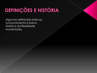 O documento discute definições, história e aplicações da realidade aumentada. Apresenta definições básicas como a sobreposição de objetos virtuais no mundo real e discute os tipos de dispositivos e experiências do usuário. Também resume brevemente a origem e evolução histórica da realidade aumentada desde 1960 e exemplos atuais de aplicações fixas e móveis.