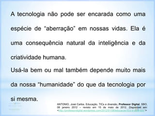O documento discute o uso das tecnologias digitais na educação. Ele argumenta que a tecnologia não deve ser vista como algo separado da vida humana, mas sim como uma consequência natural da criatividade humana. Além disso, o documento defende a incorporação das ferramentas digitais na prática pedagógica de forma a tornar os processos educativos mais produtivos.