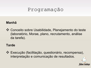 ![Érico Fernandes Fileno, M.Sc. - Designer de Interação - Especialista em Experiência do Usuário - Pesquisador em Usabilidade [email_address] http://ericofileno.wordpress.com @efileno Contato](https://image.slidesharecdn.com/oficinatestedeusabilidade-100614210737-phpapp01/85/Oficina-teste-de-usabilidade-55-320.jpg)