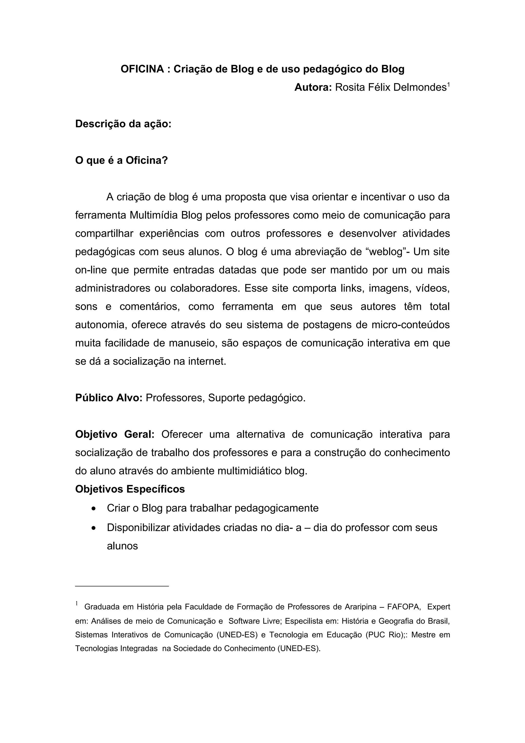 Este documento descreve uma oficina para ensinar professores a criar e usar blogs de forma pedagógica. A oficina ensina como criar um blog usando ferramentas como Gmail ou Blogger, como adicionar conteúdo multimídia, e como usar blogs para compartilhar atividades em sala de aula com outros professores e estudantes. O objetivo é mostrar como blogs podem ser usados para comunicação interativa e construção de conhecimento.