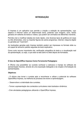 Este documento fornece instruções sobre como usar o aplicativo OpenOffice Impress para criar apresentações eletrônicas para fins educacionais. Ele discute como criar slides, inserir texto, imagens e hiperlinks, adicionar transições e animações, e apresentar o slideshow. O documento também fornece dicas sobre como usar as apresentações em sala de aula de forma efetiva.