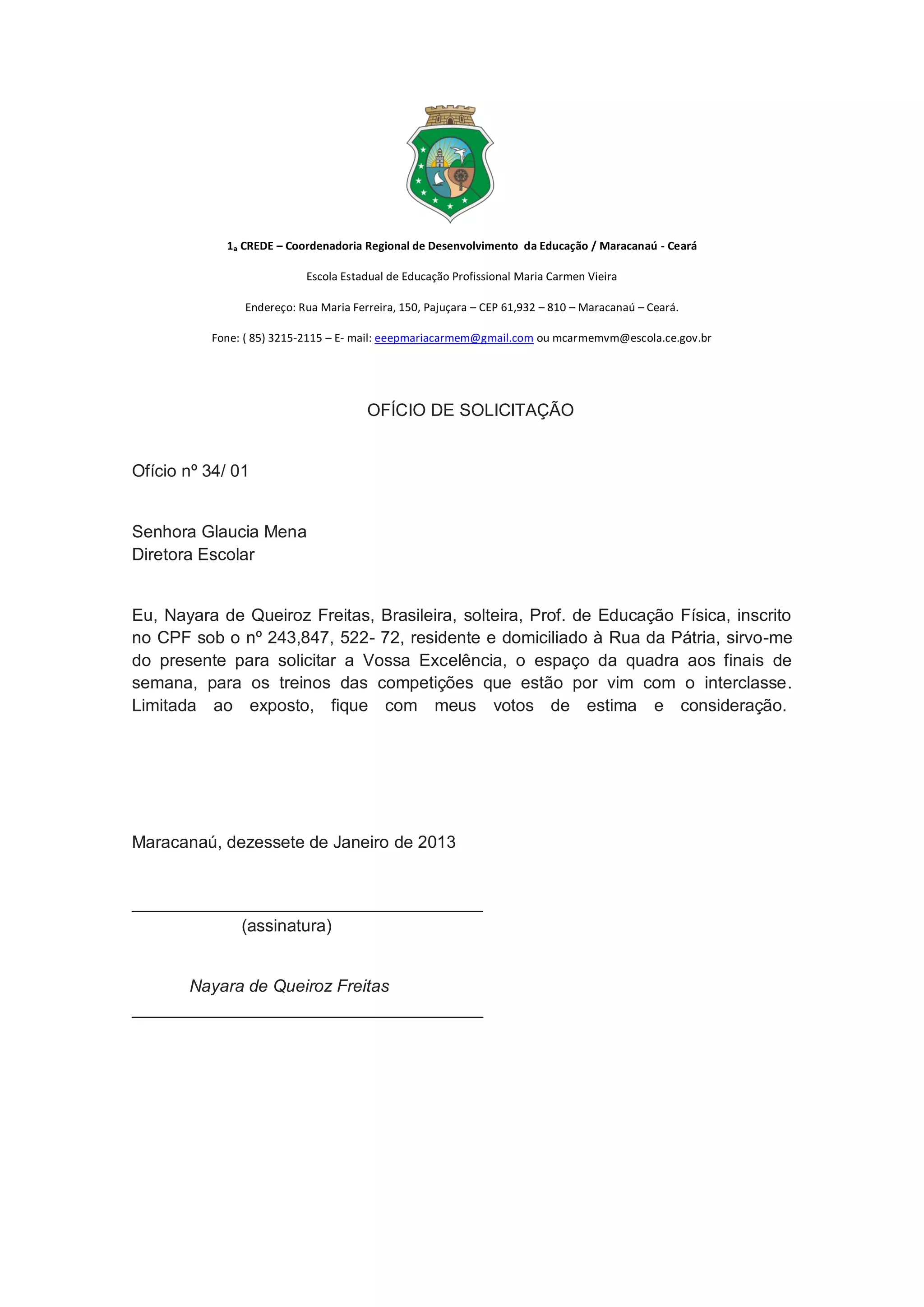 1) A professora Nayara de Queiroz Freitas solicita à diretora Glaucia Mena o uso da quadra da escola nos finais de semana para treinos das competições interclasses que estão por vir.